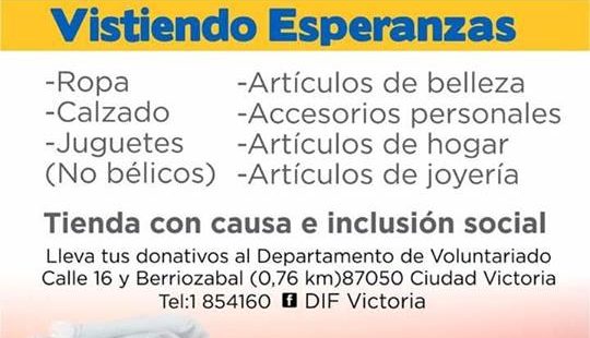 Ciudad Victoria, Tamps., 09 de enero de 2019.-  El Sistema DIF Victoria, que preside la señora Arcelia Flores de González, sigue invitando a todos los victorenses a unirse a esta noble causa y apoyar con tus donaciones para “Mi Tiendita DIF” que en beneficio a personas con discapacidad y escasos recursos.