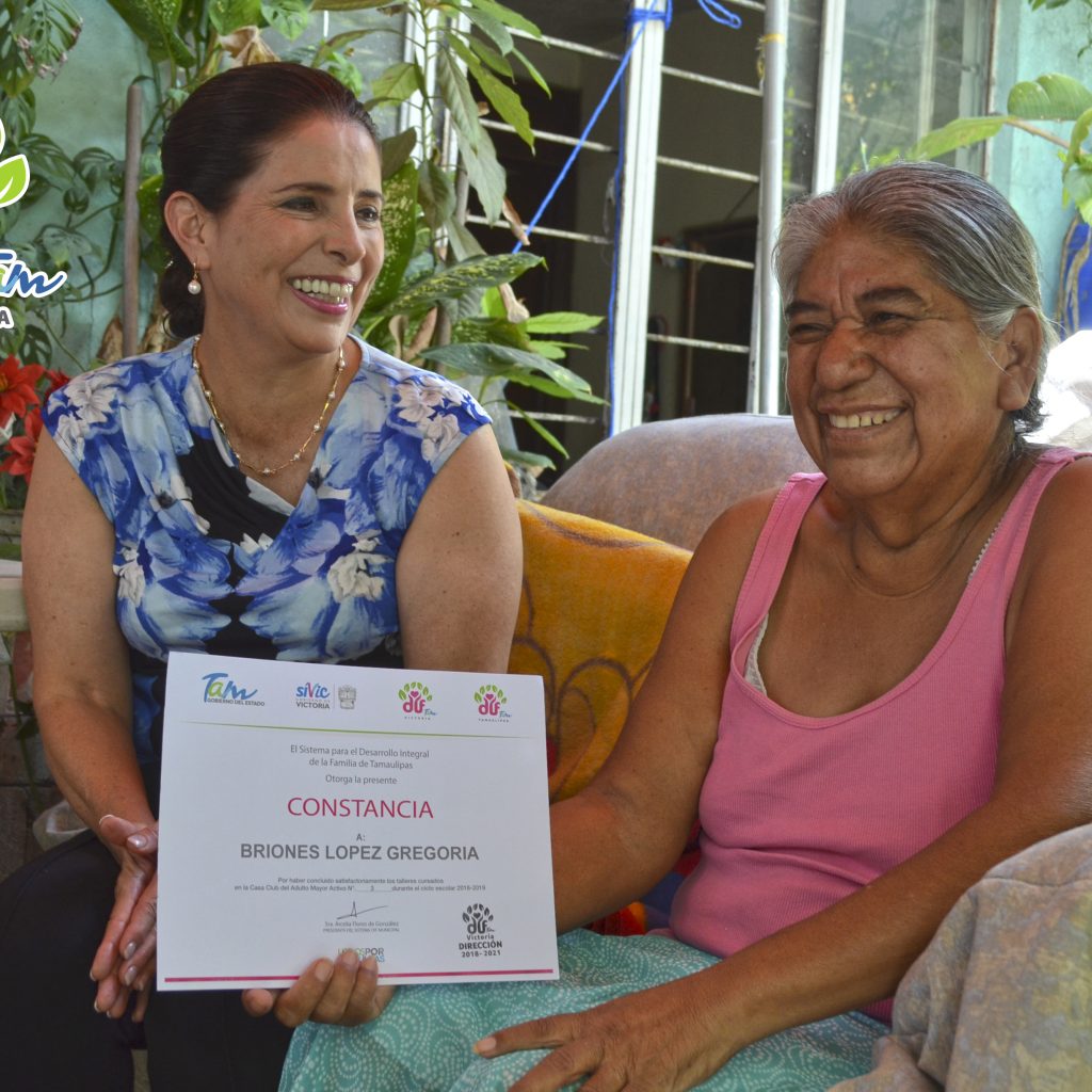 Preocupada por el bienestar de las familias victorenses, la señora Arcelia Flores, presidenta del Sistema DIF Victoria, visitó en su domicilio a la señora señora Gregoria Briones López, integrante la Casa Club del Adulto Activo No. 3, de la Colonia Estrella, y quien se encuentra delicada de salud. Ahí le hizo entrega de un reconocimiento por concluir sus talleres satisfactoriamente, de igual manera le entregó una canasta de frutas.