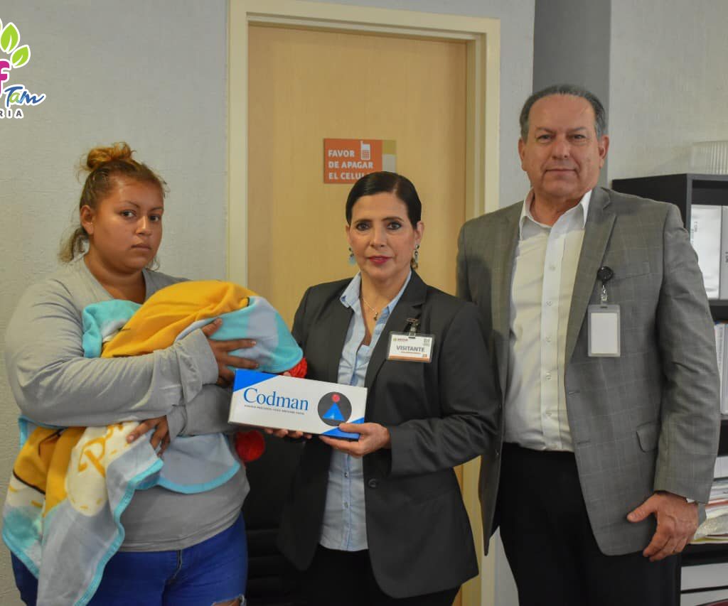Este día, la señora Arcelia Flores, presidenta del Sistema DIF Victoria y la directora general, Mtra. Juanita Anyelin Quintanilla Becerra, entregaron a los Doctores del Hospital Regional de Alta Especialidad, Vicente Enrique Flores Rodríguez, director general; Oscar Manuel Berlanga, jefe de la División de Pediatría y al Dr. Héctor Zamarripa Gutiérrez, director médico, una Válvula de Derivación Ventrículo Peritoneal, lo que le permitirá a la bebé, contar con una mejor calidad de vida.