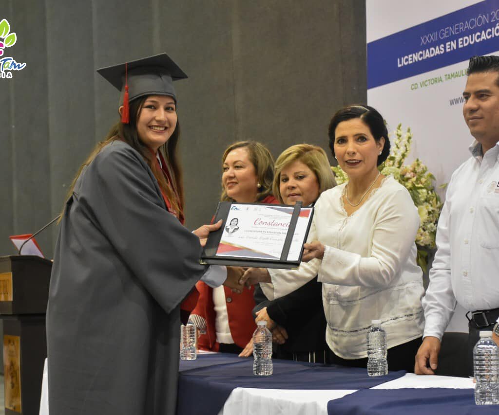 Ciudad Victoria, Tamps. 12 de febrero de 2020.- Durante la graduación de la XXXII Generación de la Licenciatura en Educación Preescolar, de la Escuela Normal Federal de Educadoras “Estefanía Castañeda”, la señora Arcelia Flores, presidenta del Sistema DIF Victoria, entregó constancias de pasante, así como, la medalla al mérito “Guadalupe Victoria”, a la alumna Paola Guadalupe Moreno Medina, por haber obtenido el segundo lugar de aprovechamiento educativo. Además, felicitó a las graduadas por concluir esta importante etapa en su vida, al formar parte del ejército que educa y edifica mejores oportunidades para la niñez tamaulipeca.