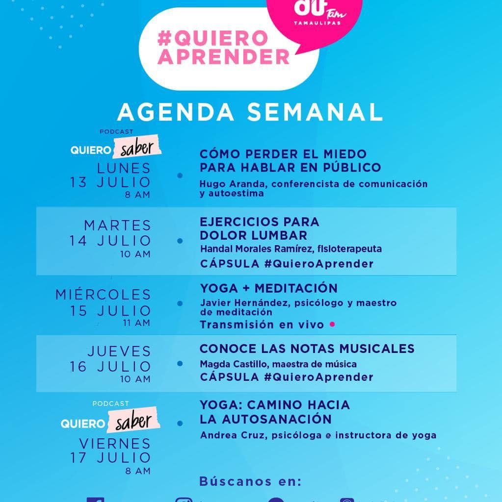 Ciudad Victoria Tamaulipas.- 13 de julio de 2020.- Los invitamos a seguir las transmisiones en vivo de las cápsulas de #QuieroAprender, a través de la página del Sistema