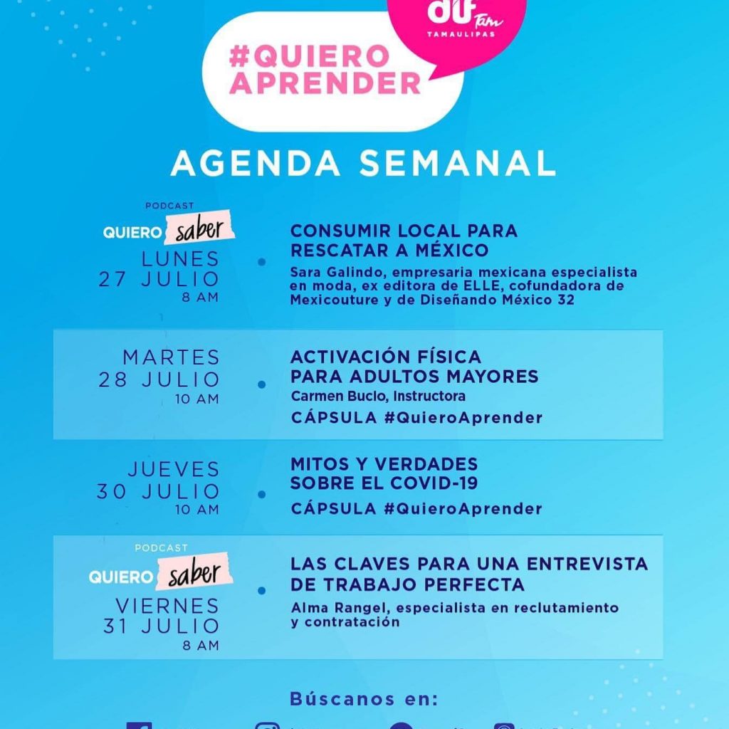 Ciudad Victoria Tamaulipas.- 26 de julio de 2020.- Los invitamos a seguir las transmisiones en vivo de las cápsulas de #QuieroAprender, a través de la página del Sistema DIF Tamaulipas.