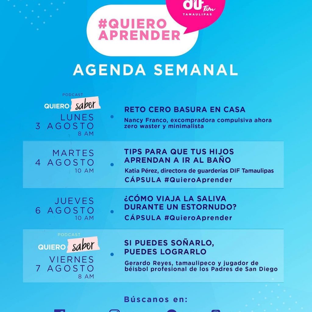 Ciudad Victoria Tamaulipas.- 03 de agosto de 2020.- Los invitamos a seguir las transmisiones en vivo de las cápsulas de #QuieroAprender, a través de la página del Sistema DIF Tamaulipas.