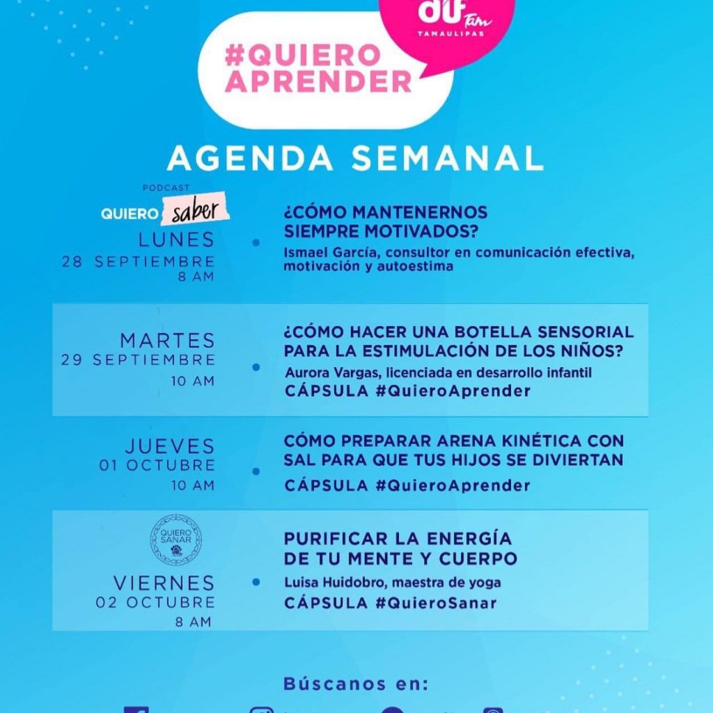 Ciudad Victoria Tamaulipas, 27 de septiembre de 2020.- Los invitamos a seguir las transmisiones en vivo de las cápsulas de #QuieroAprender, a través de la página del Sistema DIF Tamaulipas.
