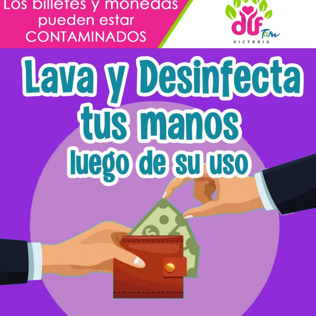 Ciudad Victoria Tamaulipas, 7 de noviembre de 2020.- Recuerda desinfectar tus manos, después de usar monedas y billetes. ¡Juntos nos cuidamos contra el COVID-19!