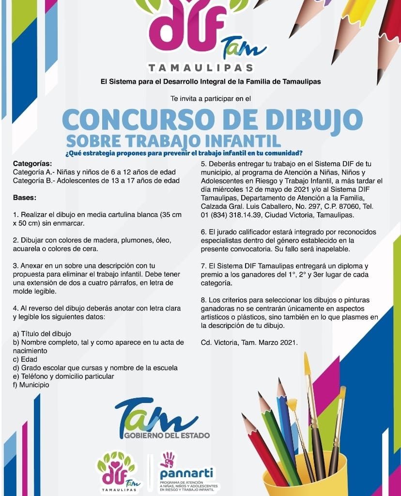 Te invitamos a participar en el “Concurso de Dibujo Sobre Trabajo Infantil” del #DIFTamaulipas el cual es dirigido a niñas, niños y adolescentes de 6 a 17 años.